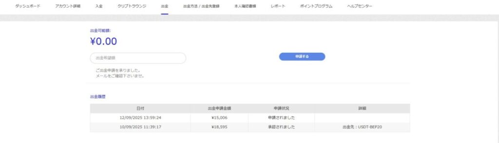 出金申請が受け付けられると、出金履歴に申請内容が表示されます。この時点で申請状況は「保留中」または「出金手続き中」となります。