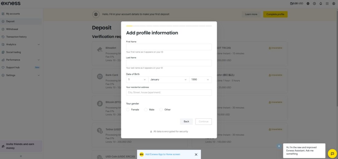 Exnessの口座開設手続きは非常にシンプルで、以下の3つの基本情報を入力するだけで完了します。