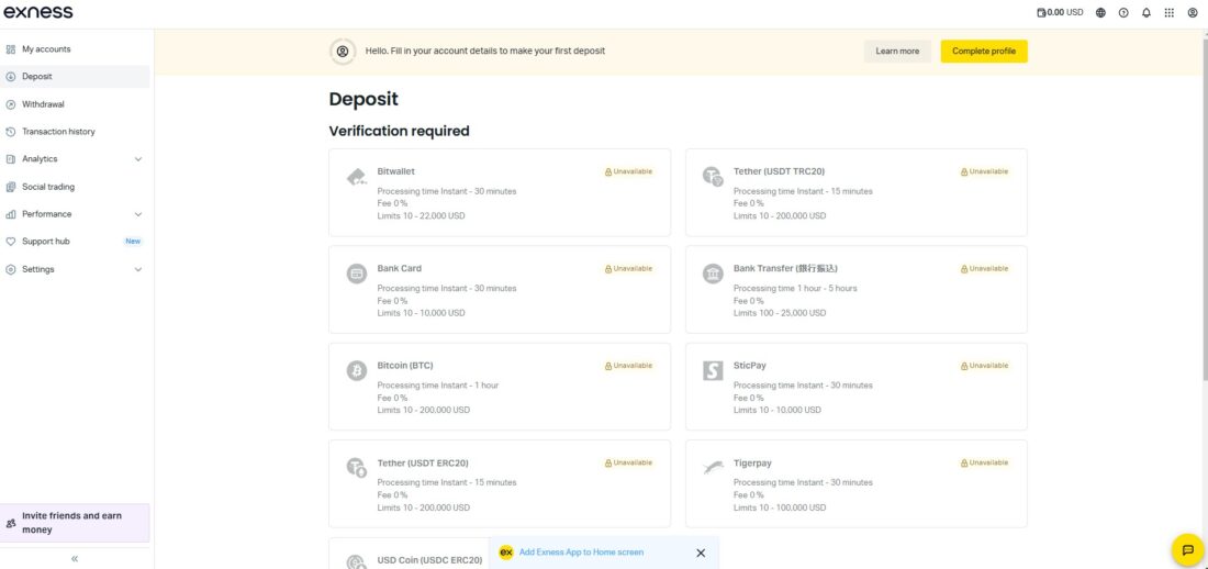 - Exnessでは複数の通貨で取引口座を開設できます。一般的にはUSD(米ドル)、EUR(ユーロ)、JPY(日本円)など主要通貨から選択可能です。選択した通貨によって入出金方法や手数料が異なる場合があります。