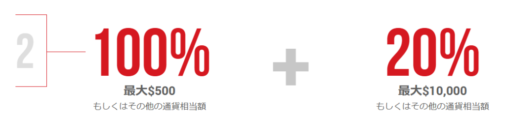 2. 20%入金ボーナス: 500ドルを超えた分に対し、最大総額1万ドル(1ドル=150円の場合、150万円)に達するまで20%のボーナスが付与され続けます。