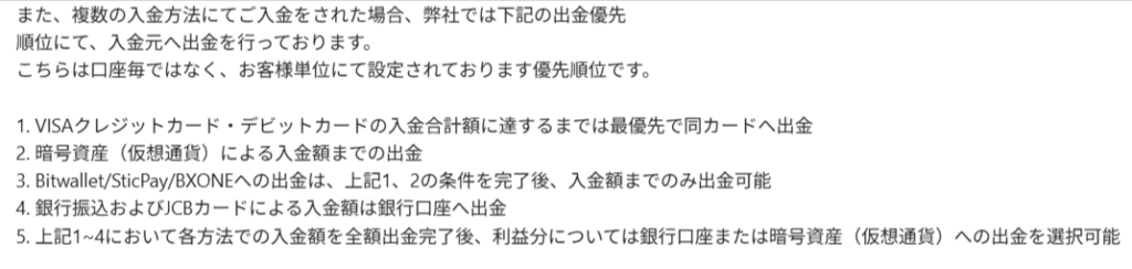 | 優先順位④ | 国内銀行送金(JCBカードによる入金も国内銀行送金で出金) |