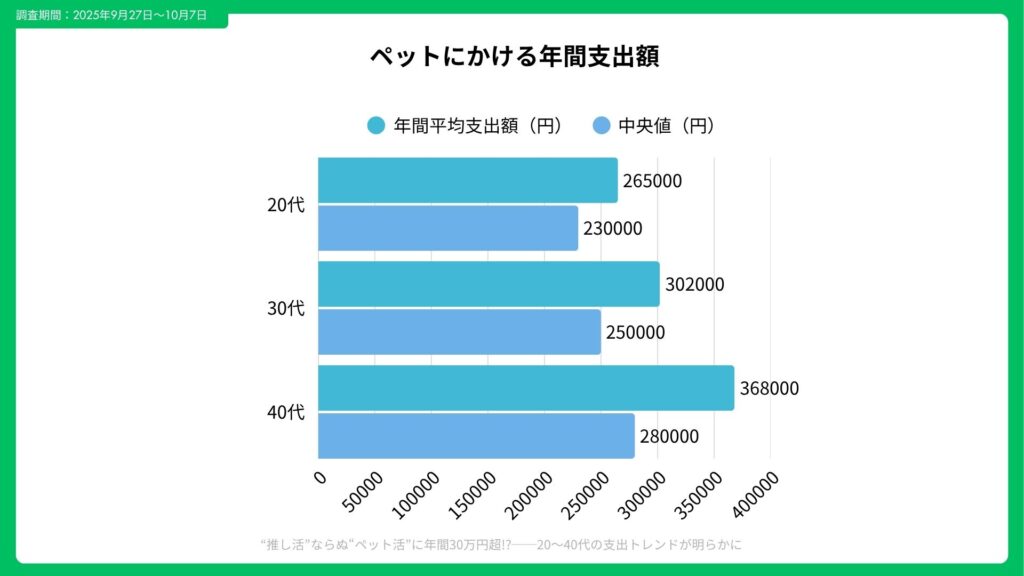 ペットにかける年間支出は平均31.4万円、中央値25万円でした。年代別では40代が平均36.8万円と最も高く、20代は26.5万円、30代は30.2万円でした。高額化の背景には「健康維持や長寿への意識」が見られます。