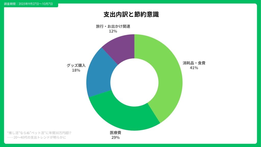 支出の内訳を見ると、最も多いのは消耗品・食費(41%)、次いで医療費(29%)、グッズ購入(18%)、旅行・お出かけ関連(12%)となりました。コロナ禍以降、「おうち時間」をきっかけにグッズやケア用品に投資する層が増えています。