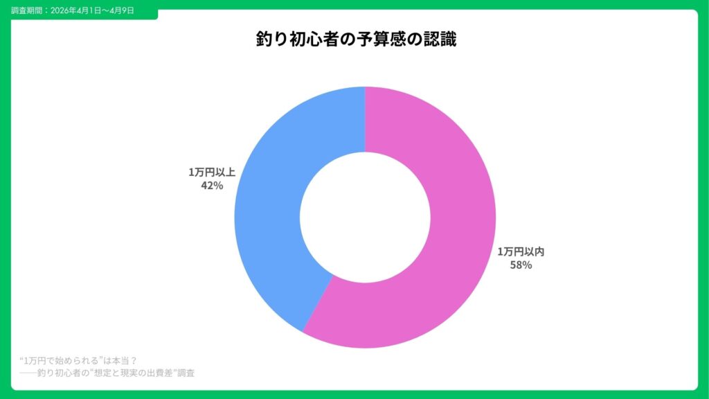 釣りを始める前に想定していた初期費用について調査したところ、「1万円以内で始められると思っていた」と回答した人は 58% にのぼった。平均想定額は¥11,200、中央値は¥10,000となり、“1万円前後で始められる”という認識が主流であることが分かる。