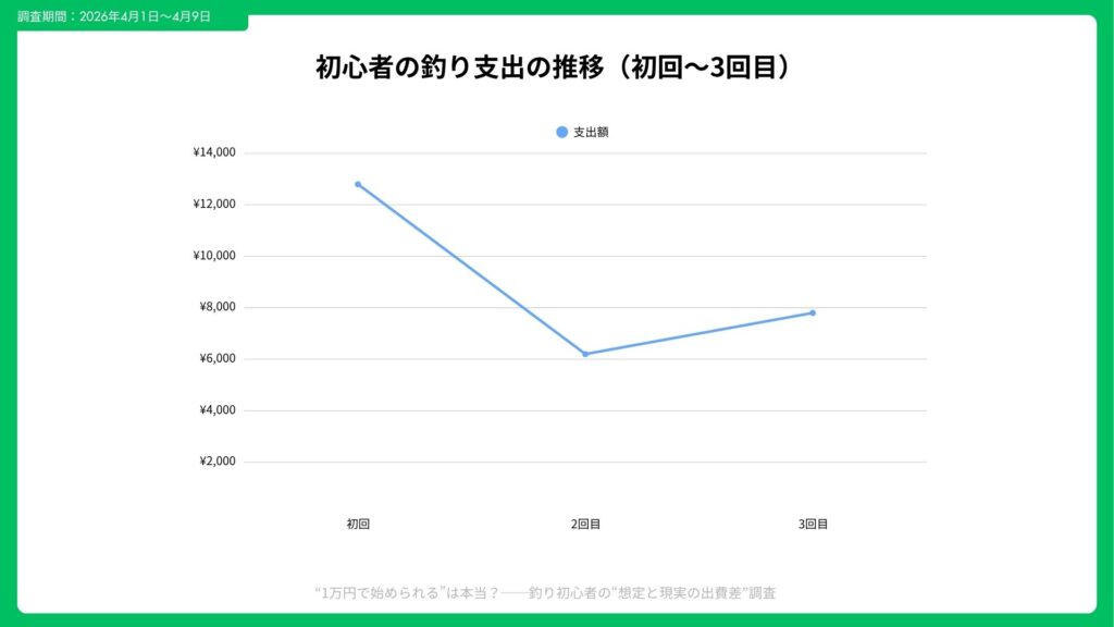 「1万円で始められる」という情報は、最低限の道具価格としては間違いではない。しかし実際には、初回〜3回目までで平均¥26,800の支出が発生しており、想定との差は小さくない。特に、消耗品、ロスト、交通費、釣り場料金など、道具以外の出費が初心者の予算を押し上げていた。