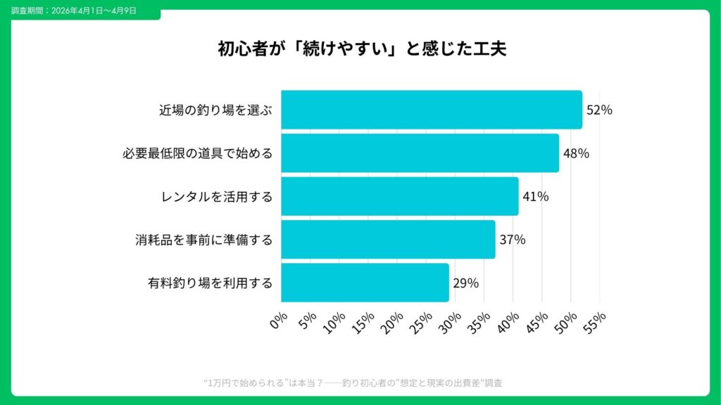 初心者が出費ギャップを抑えるために有効だった方法として、レンタル利用、中古購入、必要十分なセット選び、近場釣行への切り替えが挙げられた。特にレンタルを活用した層では、平均で約28%のコスト削減が見られた。
